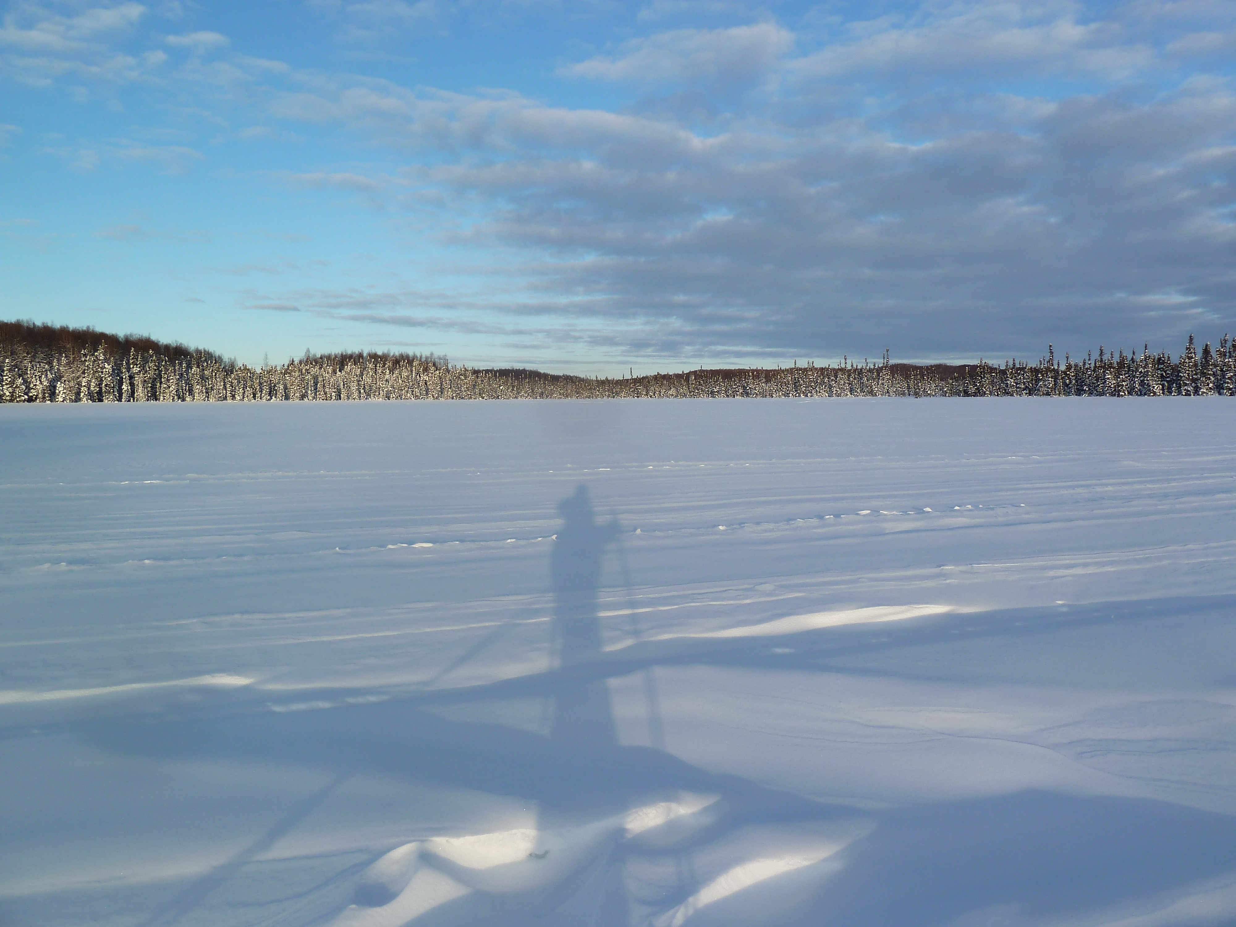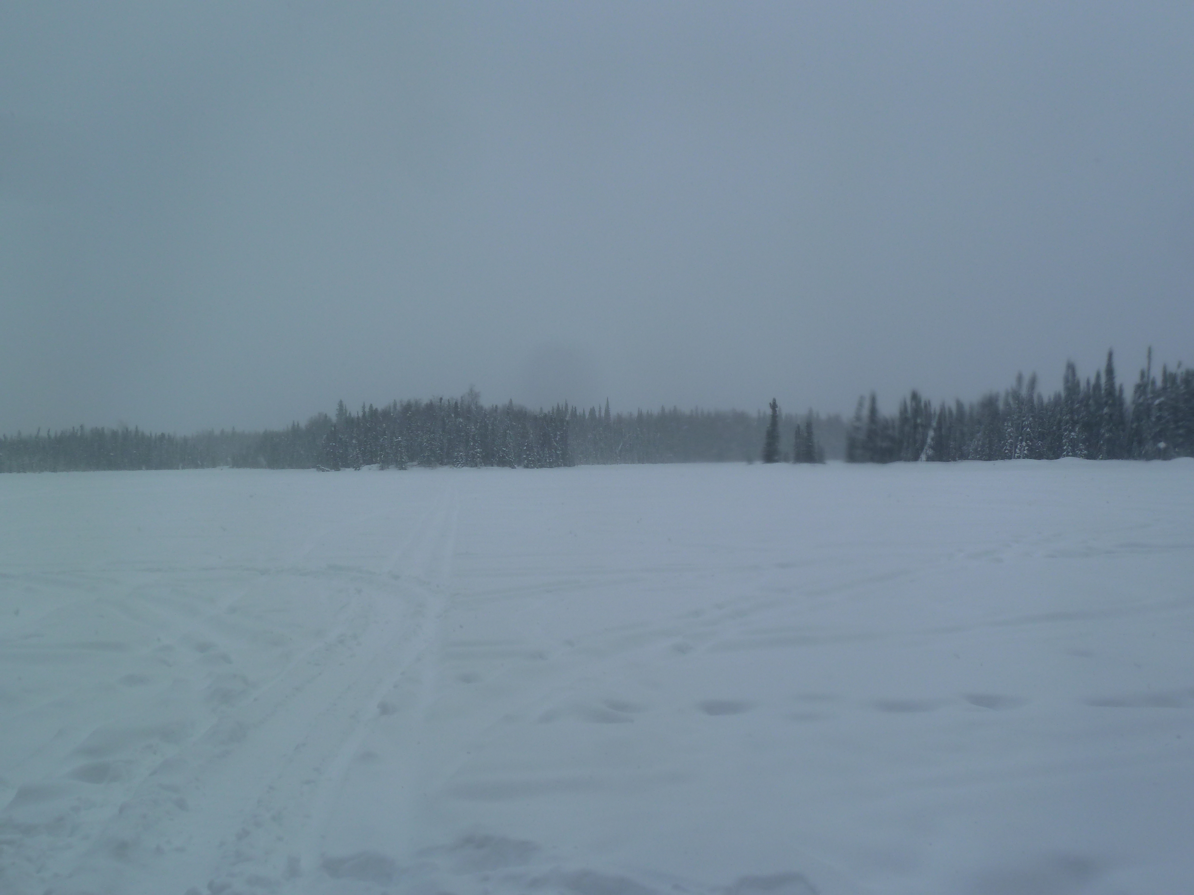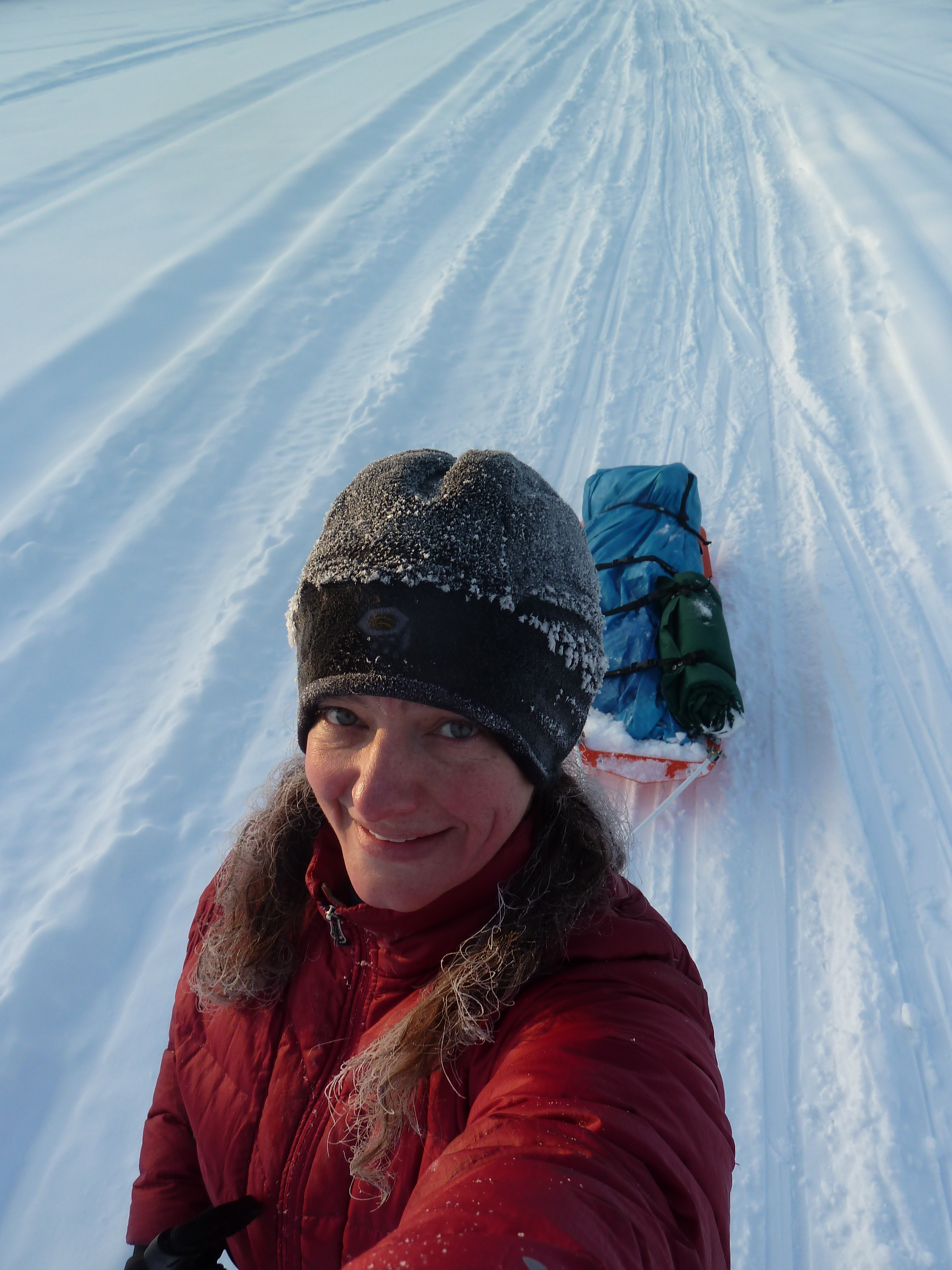 When crossing the lakes, there are several portages, of course. These pictures don’t really do them justice, but for many of them, you have to take your skis off, hike up and down some hills, and then proceed skiing on the other side. There are times when you take on the snowmachine moguls for an attempt at a thrill without ending up in a yard sale; this is the term typically used when referring to a crash that leads to equipment being sprawled out in every direction. You’ve heard of this, right? I am an expert at yard sales in certain situations. While not as risky as downhill skiing, going downhill on touring skis with a pulk and pack is not easy. It’s pretty difficult to maintain your balance carrying a pack with the addition of your pulk poles pushing onto you from your sled weight. We gave it a shot here and there, and good time screaming commenced! Fortunately, no one broke anything.