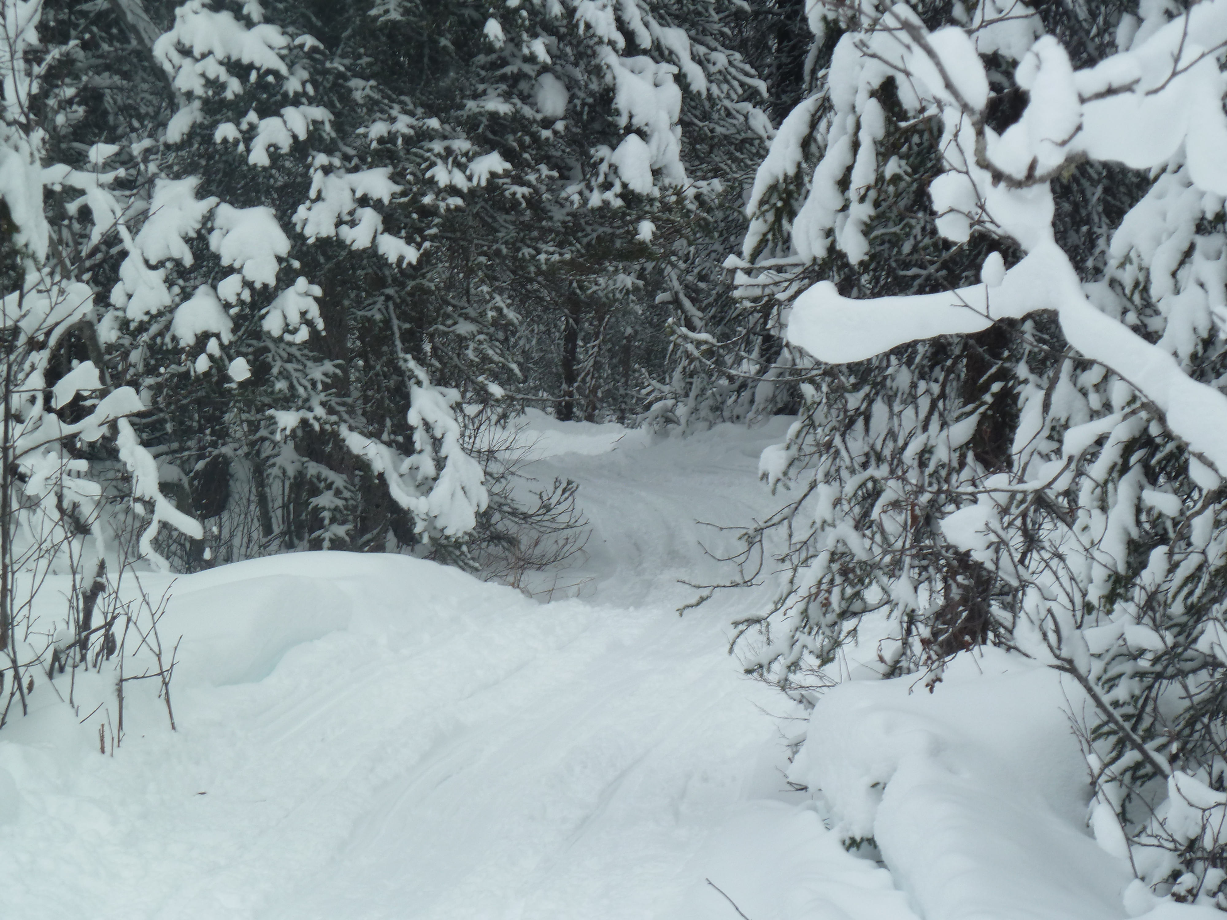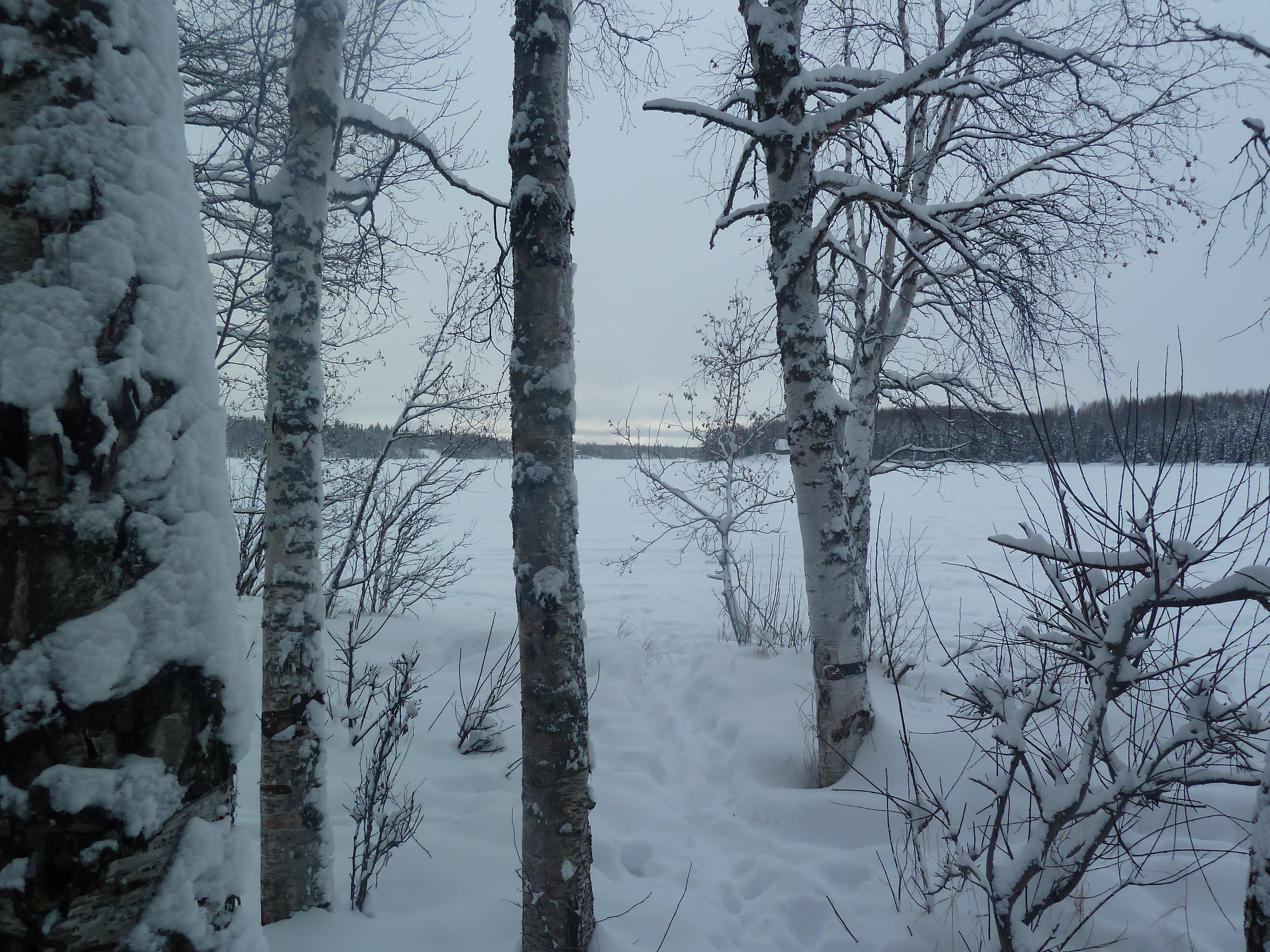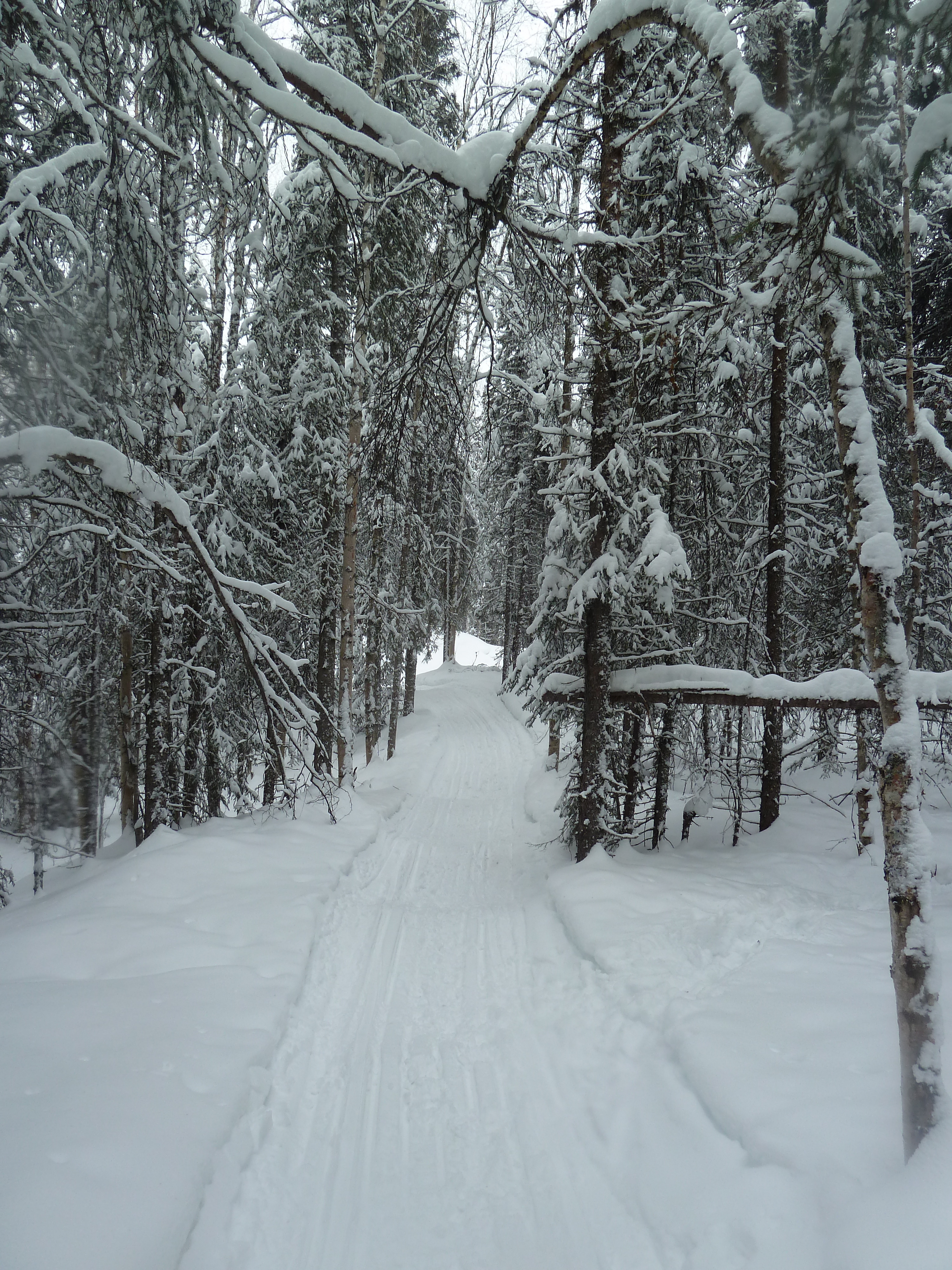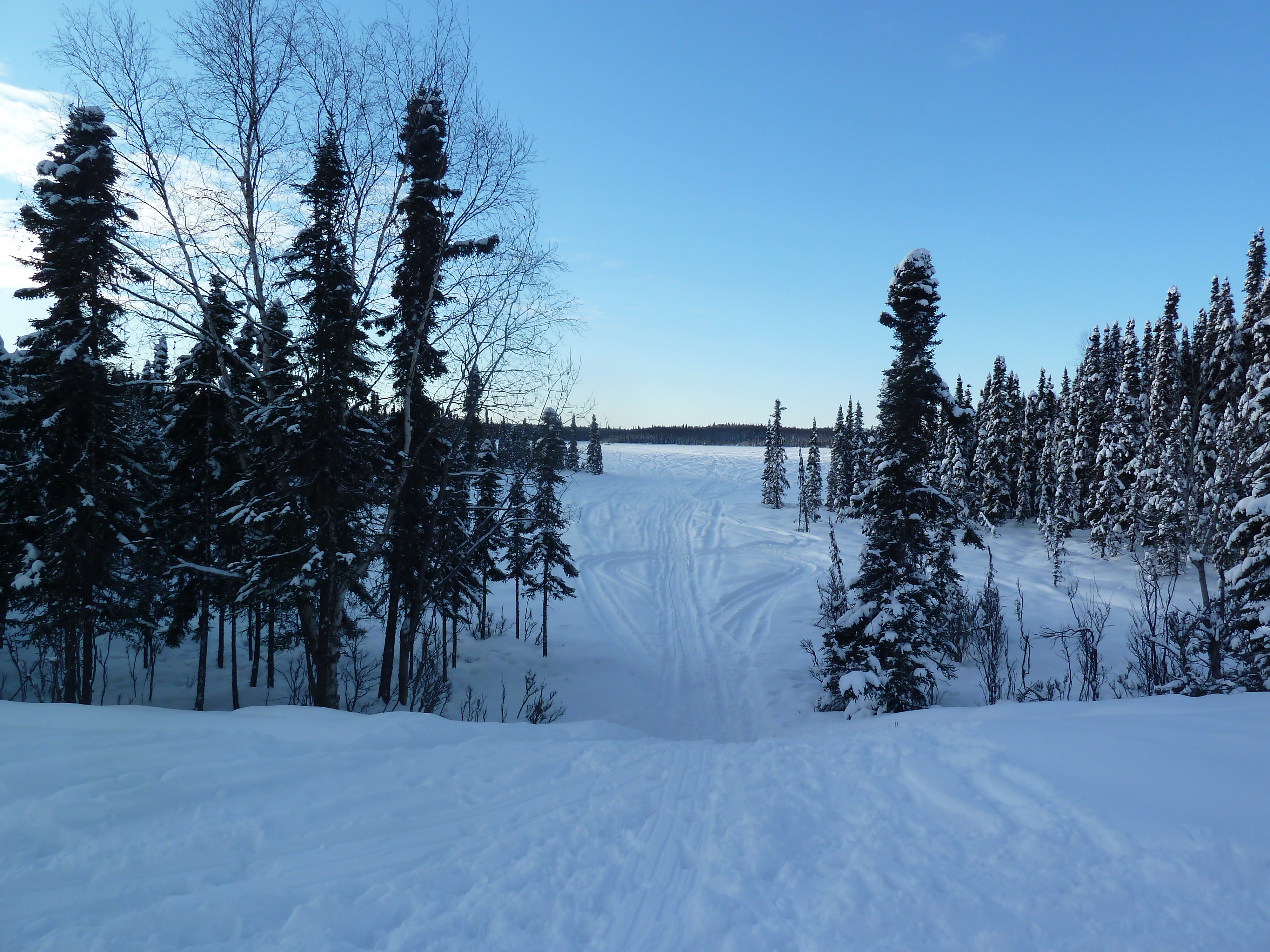 When crossing the lakes, there are several portages, of course. These pictures don’t really do them justice, but for many of them, you have to take your skis off, hike up and down some hills, and then proceed skiing on the other side. There are times when you take on the snowmachine moguls for an attempt at a thrill without ending up in a yard sale; this is the term typically used when referring to a crash that leads to equipment being sprawled out in every direction. You’ve heard of this, right? I am an expert at yard sales in certain situations. While not as risky as downhill skiing, going downhill on touring skis with a pulk and pack is not easy. It’s pretty difficult to maintain your balance carrying a pack with the addition of your pulk poles pushing onto you from your sled weight. We gave it a shot here and there, and good time screaming commenced! Fortunately, no one broke anything.