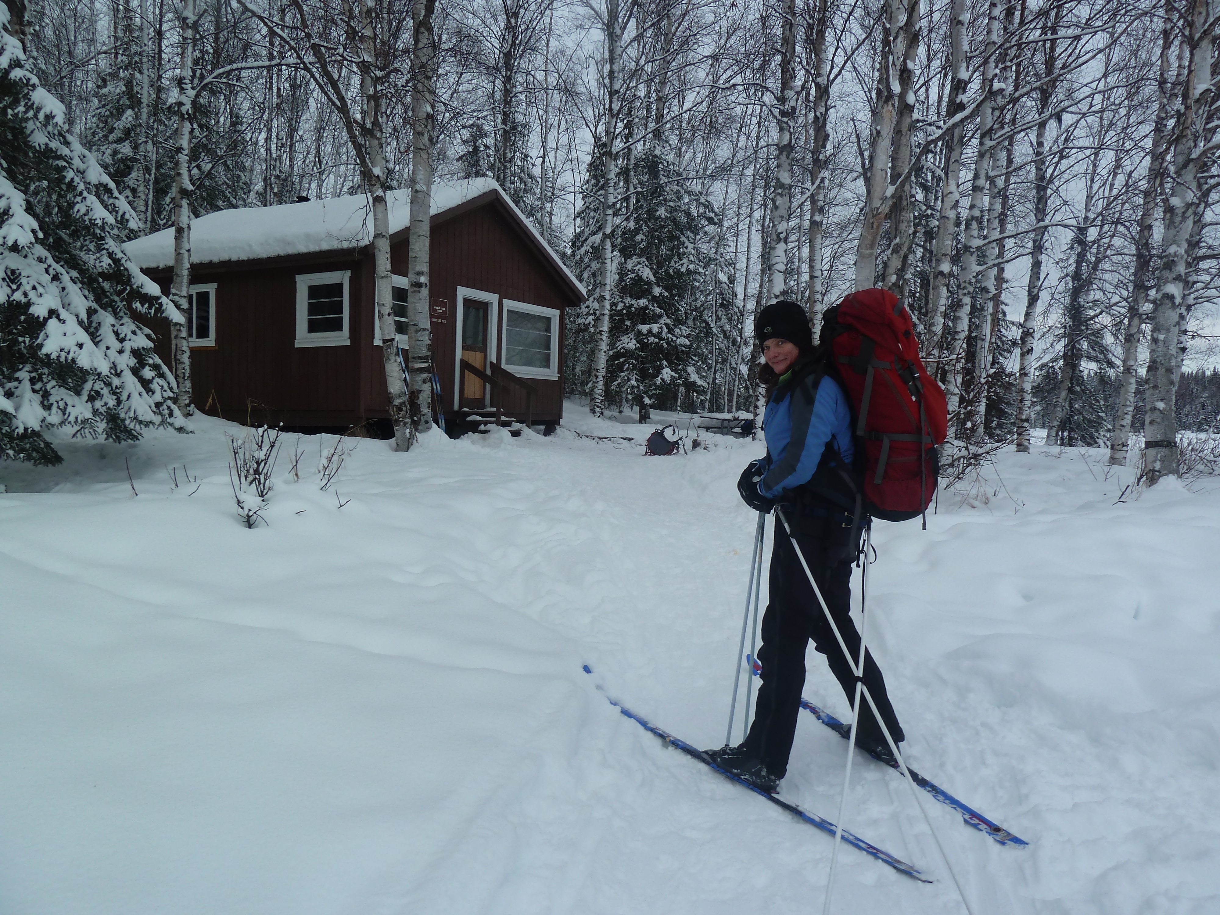 During our ski to the James Lake cabin, there were many turns and portages. Translation?=questioning of the map. Like many recreational parks in Alaska, this one is no different in that it doesn’t have enough signs or trail maps along the way to assist. With snow everywhere, it can be kind of tricky. Even though we were with a friend that had been there before, it is still a challenge. We only saw one trail map and two lake signs between our first and second cabins, but we crossed several lakes, and went over many portages. Even so, our weather was great, and the skiing was fantastic.