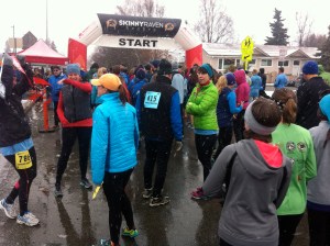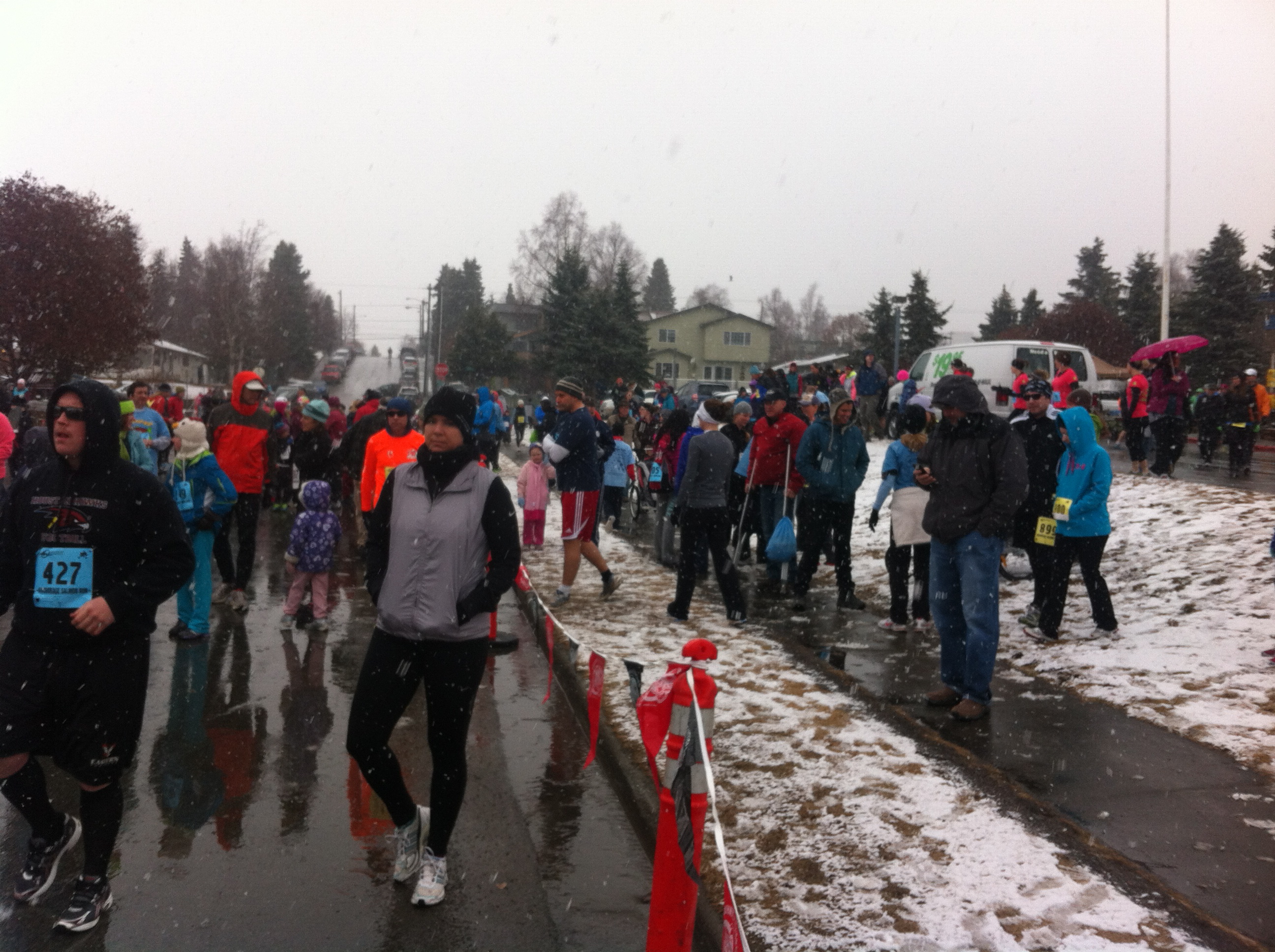 So, I know I live in Alaska, but it never snows in May. Even the born and raised locals around here are beginning to wonder where spring is! Even so, people showed up ready to run this morning at the 2013 Salmon Run! It wasn’t that cold once we started moving. I’ve been gradually moving up to 100% training in minimalist shoes and this year, I threw out my regular shoes. It’s been an interesting transition and this would be my first race in them. I met both of my goals: run the entire race from toe to heel and make my time.  Success!